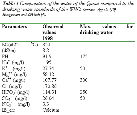 In Syria many ancient qanat irrigation systems have been abandoned due to falling water tables as a result of the increased use of modern electric and diesel-pumped wells. Lightfoot (1996) stated that